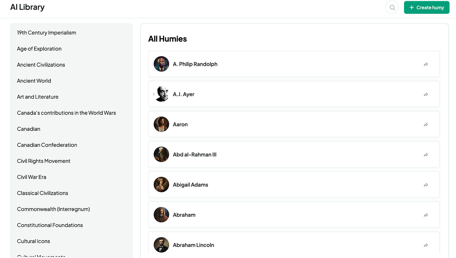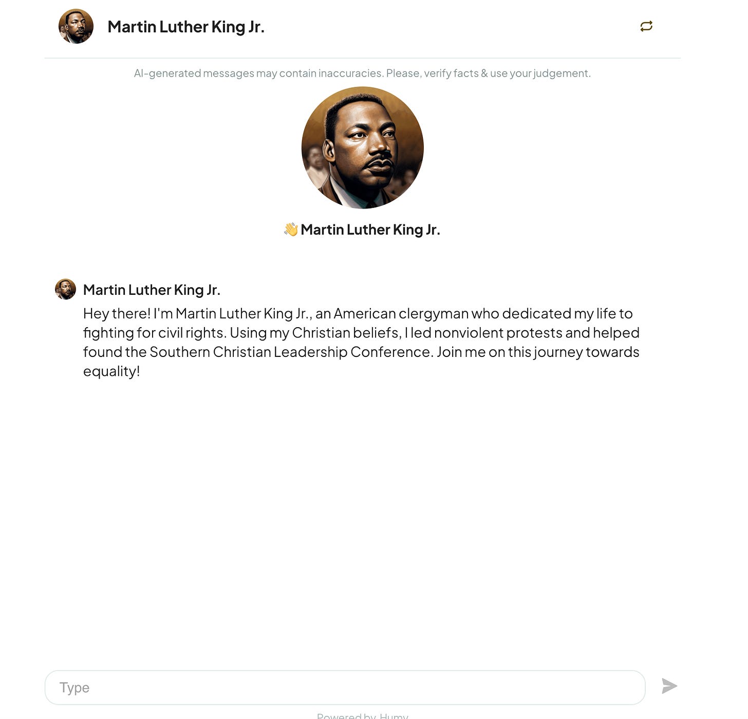 In recognition of Martin Luther King Jr. Day, I am excited to introduce an innovative educational technology, "Hello History" by Humy, that offers a unique learning opportunity for students. This advanced AI tool enables students to engage in dialogues with a diverse range of over 1000 historical figures, encompassing everyone from Martin Luther King Jr. to Poseidon.